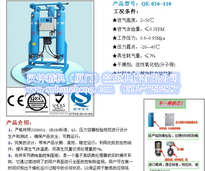 微熱再生吸附式干燥機是一種節(jié)能高效的干燥機,是吸收了有熱再生和無熱再生的優(yōu)點而研發(fā)的產品,再生的氣體在微加熱升高溫度后用于對吸附塔床層的吹掃再生,可節(jié)約再生耗氣量,再生效果好,吸附工作時間更長。
